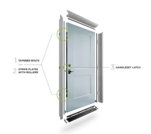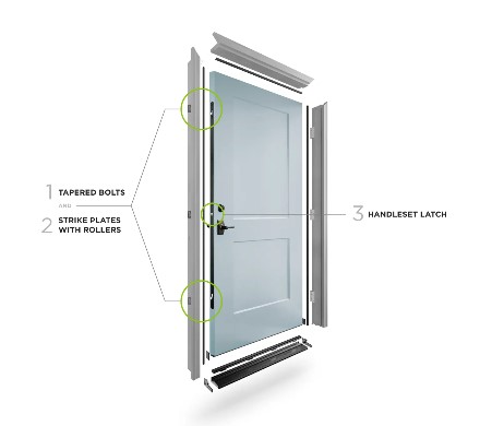 - Handleset latch – While the deadbolt secures the tapered bolts, the handleset engages the latch.